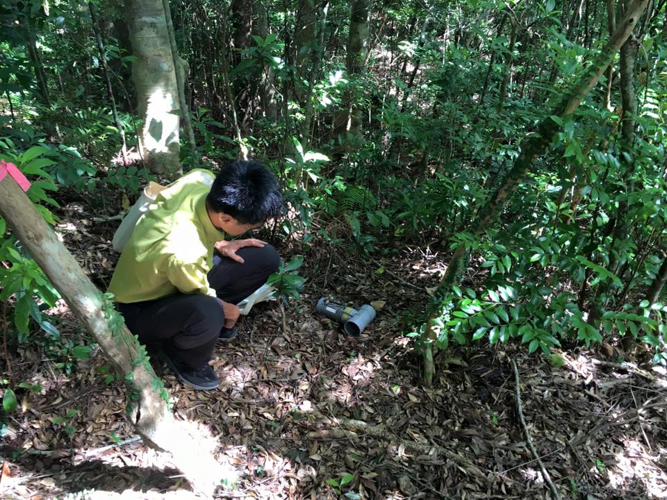 金作原原生林は自然の生態系を壊さないように未舗装の狭い林道を通って到着。森林の中でマングースの罠に遭遇しました。