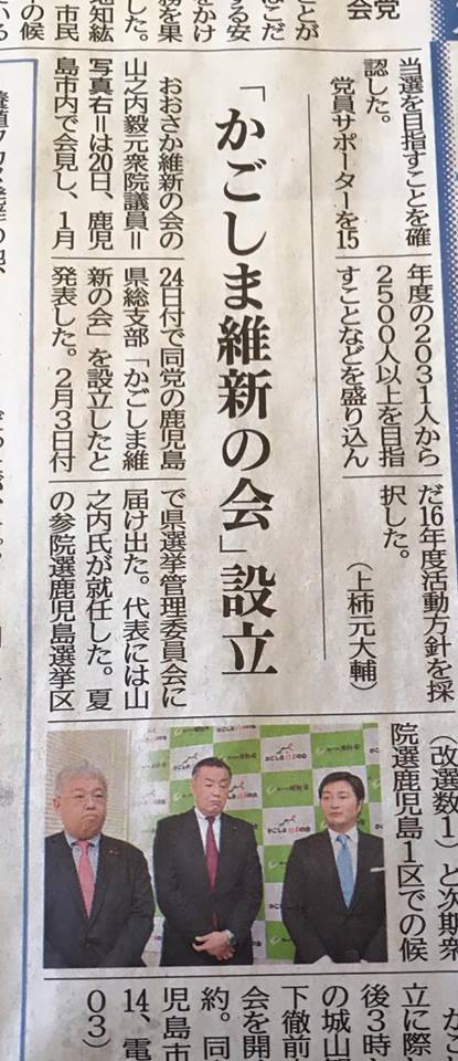 2016年2月20日 2016年2月20日 最終更新日時 : 2026年3月28日 kawano-admin カテゴリ地元福岡での活動 陸路 鹿児島に移動し、「かごしま維新の会」山之内 前代議士と懇談し、記者会見に立ち会いました。「おおさか維新の会」党勢拡大に向け、九州各地の課題の一端を確認することができました。