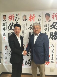 今週末、23日告示の東京都議会議員選挙に立候補予定のひえしま進さん(世田谷区)とやながせ裕文さん(大田区)の事務所に訪問し、今後の戦略についてなど話し合いました。